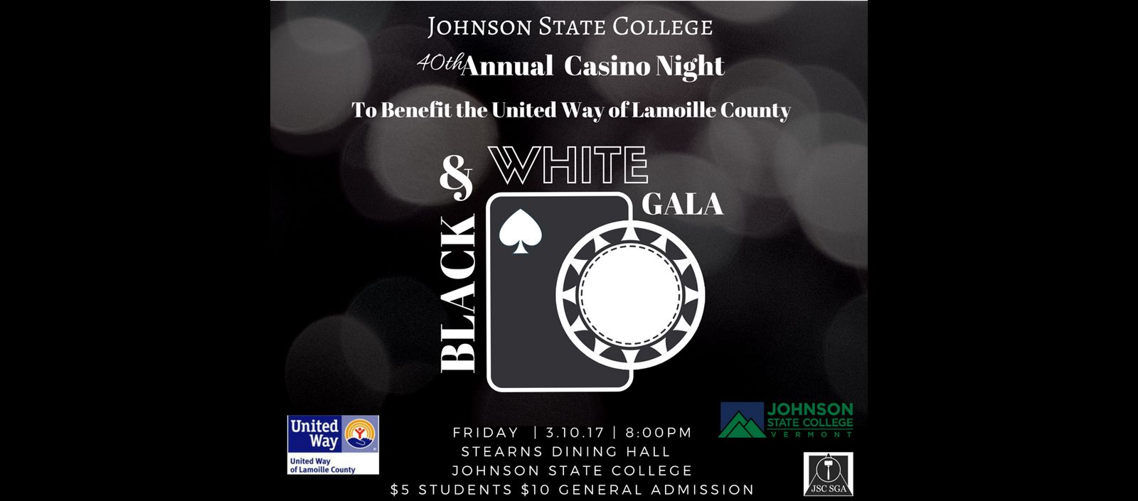 Join us for a night of fun and prizes at Johnson State College's Stearns Dining Hall. Black and White Attire fundraiser for The United Way of Lamoille County put on by the JSC Student Government Association. $5 for students. $10 General Admission