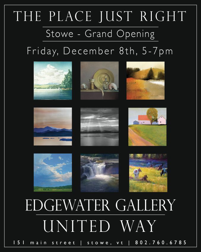 Edgewater Gallery & United Way invite you to the opening of a new gallery location in Stowe. Join us Friday, December 8th from 5-7pm for lite bites, music and a painting raffle of donated works from Homer Wells, Matt Brown and Joe Bolger. You do not need to be present to win! All ticket proceeds will be donated to the United Way of Lamoille County. Raffle tickets can be purchased for $20 in advance on The Edgewater Gallery Website, The United Way of Lamoille County website, or in person at any Edgewater Gallery location. For all additional questions, please contact info@edgewatergallery-vt.com